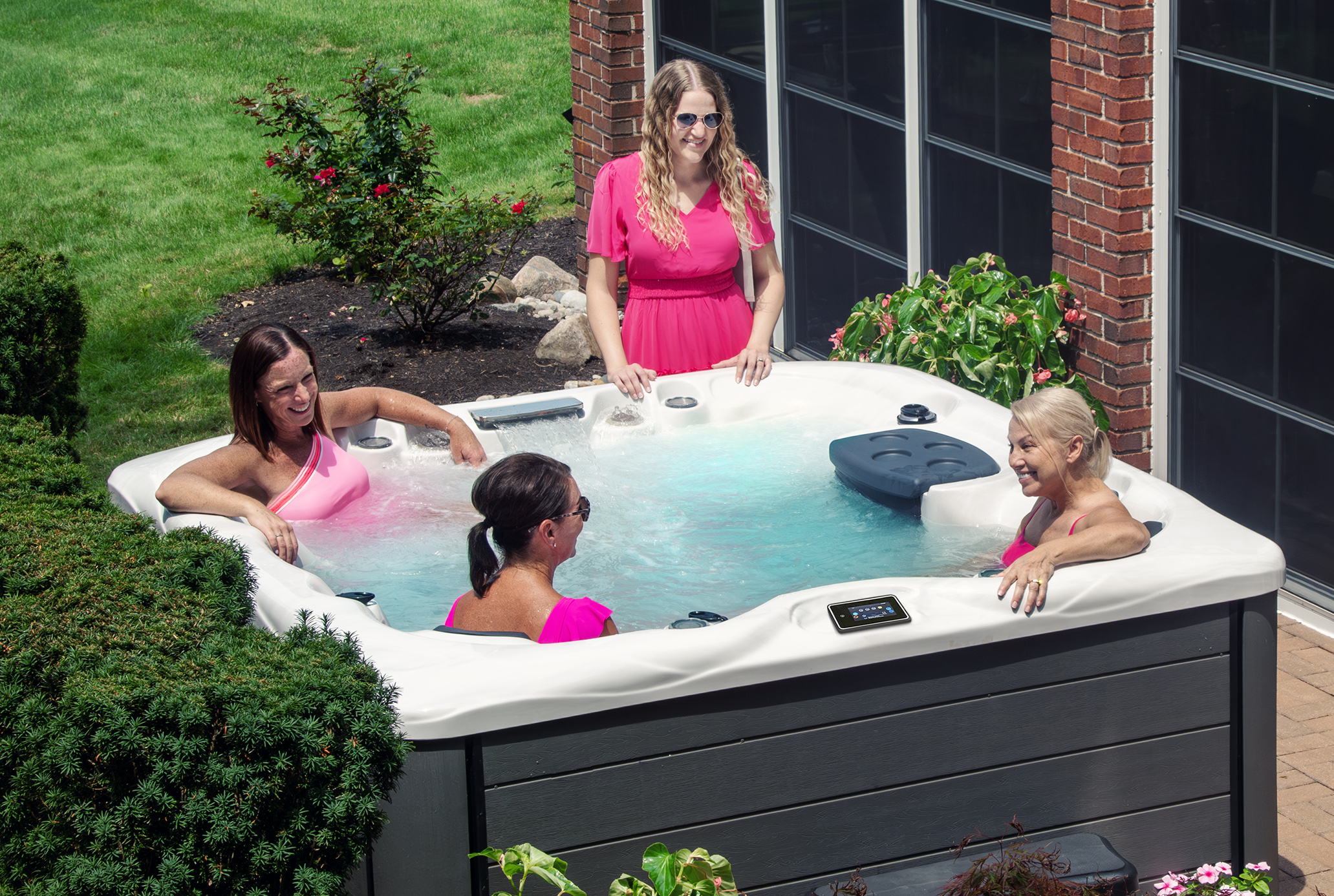 Women relax in and around Michael Phelps hot tub